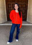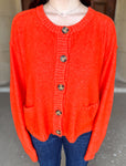 A timeless layer with everyday ease and a pop of color, this knit cardigan features a round neckline, button front, and long sleeves. Ribbed trim and a subtle hi-low hem add texture and shape, while front patch pockets offer a practical touch. Perfect in a bold red-orange hue to brighten any look.