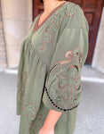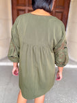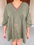 Delicate and dreamy, this Tillie Floral Embroidered Dress features a flattering V-neckline and contrast stitch detailing for a touch of artisanal charm. The 3/4 peasant sleeves and eyelet cutouts add breezy, feminine flair, while the soft lining ensures a comfortable fit. Effortlessly chic for any occasion.