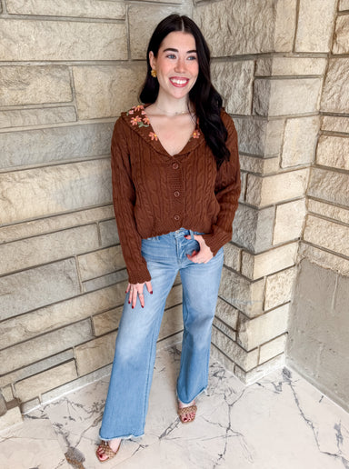 Soft and sweet, this knit sweater features an allover flower pattern in a rich deep baby blue hue. Designed with a ribbed high neckline, cuffs, and...