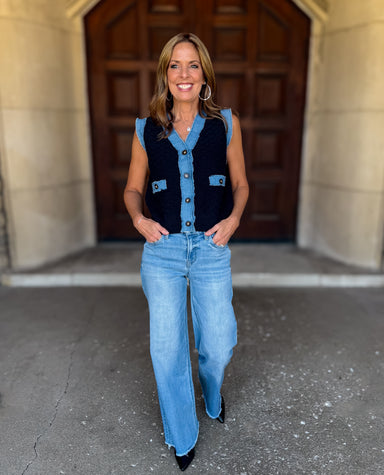 Introducing the Mindy Denim Trim Knit Vest, where vintage charm meets modern flair. This textured vest features a button front and a flattering V-n...