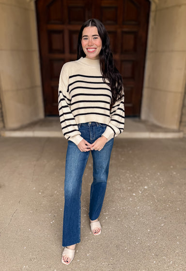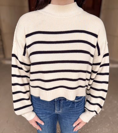 Contemporary and cozy, this striped knit sweater features a mock neckline, dropped shoulders, and exposed seam details for a laid-back, lived-in fe...