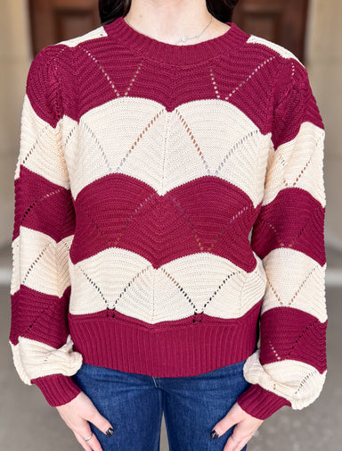 A blend of charm and texture, this pointelle knit sweater features wavy-striped detailing and a classic crew neckline. Slight puff sleeves add a fe...