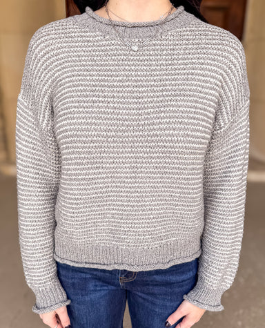 This casual Elsie Stripe Pattern Sweater features a round neckline, long sleeves, and drop shoulders for a relaxed fit. Finished with raw edge deta...