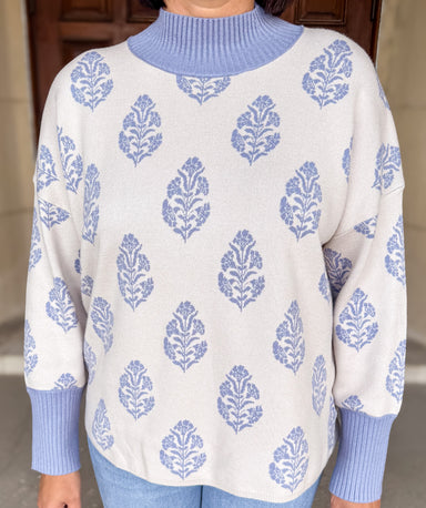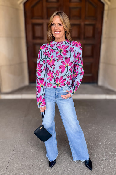 This blue floral knit sweater features an oversized jacquard pattern in rich shades of blue and green with hints of cream. Designed with puff sleev...