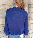 Delicate details meet cozy style in this embroidered sweater, designed with a scalloped mock neckline and matching scalloped hem for a feminine touch. The raglan seams and long balloon sleeves create a relaxed yet elegant silhouette, while ribbed trim at the neckline, cuffs, and hem adds subtle structure. Finished in a rich navy hue and crafted from a soft acrylic-blend knit, this sweater is both charming and versatile.