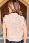 A stylish twist on a classic knit, this sleeveless sweater features a button-front design and a delicate tie at the neckline for a feminine touch. Contrast trim stitching adds subtle detail, while the soft taupe hue keeps it versatile and easy to style.