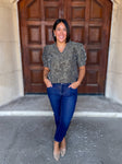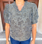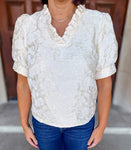 The Dina Velvet Floral Burnout Top is the epitome of elegance and femininity. This stunning top features a dressed-up V neckline adorned with delicate ruffles, adding a touch of sophistication to any outfit.