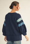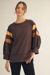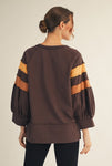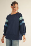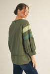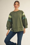 Laid-back with a playful twist, this color block top features 3/4 raglan bubble sleeves for a relaxed, feminine silhouette. Raw edge details add casual charm, while wide band cuffs and a split hem give it a polished yet easygoing finish. Crafted from a soft cotton-blend knit, it’s perfect for everyday wear.