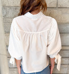Designed with 3/4 peasant sleeves and unique tie cuffs, it offers a feminine touch. The scallop trim detail along the front placket adds a charming flair, while the waist-length cut ensures a flattering fit.