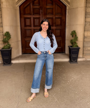 Flirty and feminine, the Joyce Lace Trim Ribbed Top features a flattering V-neckline accented with delicate lace trim. The button-down front and fi...
