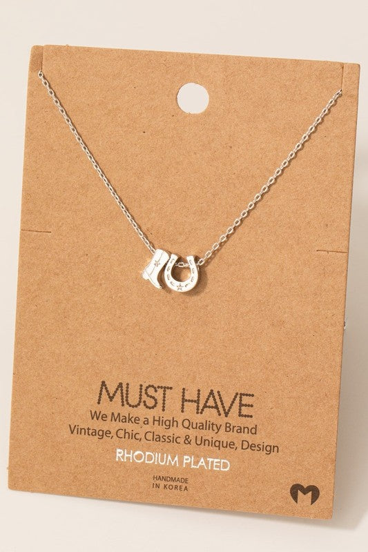 Chevron down icon Chevron down icon Cowboy Boot and Horseshoe Necklace No reviews Sale $24.00 | / Gold - Sold out Silver - $24.00 Color Gold Silver Add to cart Spinner icon IN-STOCK READY TO SHIP Notify me when back in stock Email address Email me when available 16-18" chain length 2 charms .25" each Gold/Rhodium plated brass