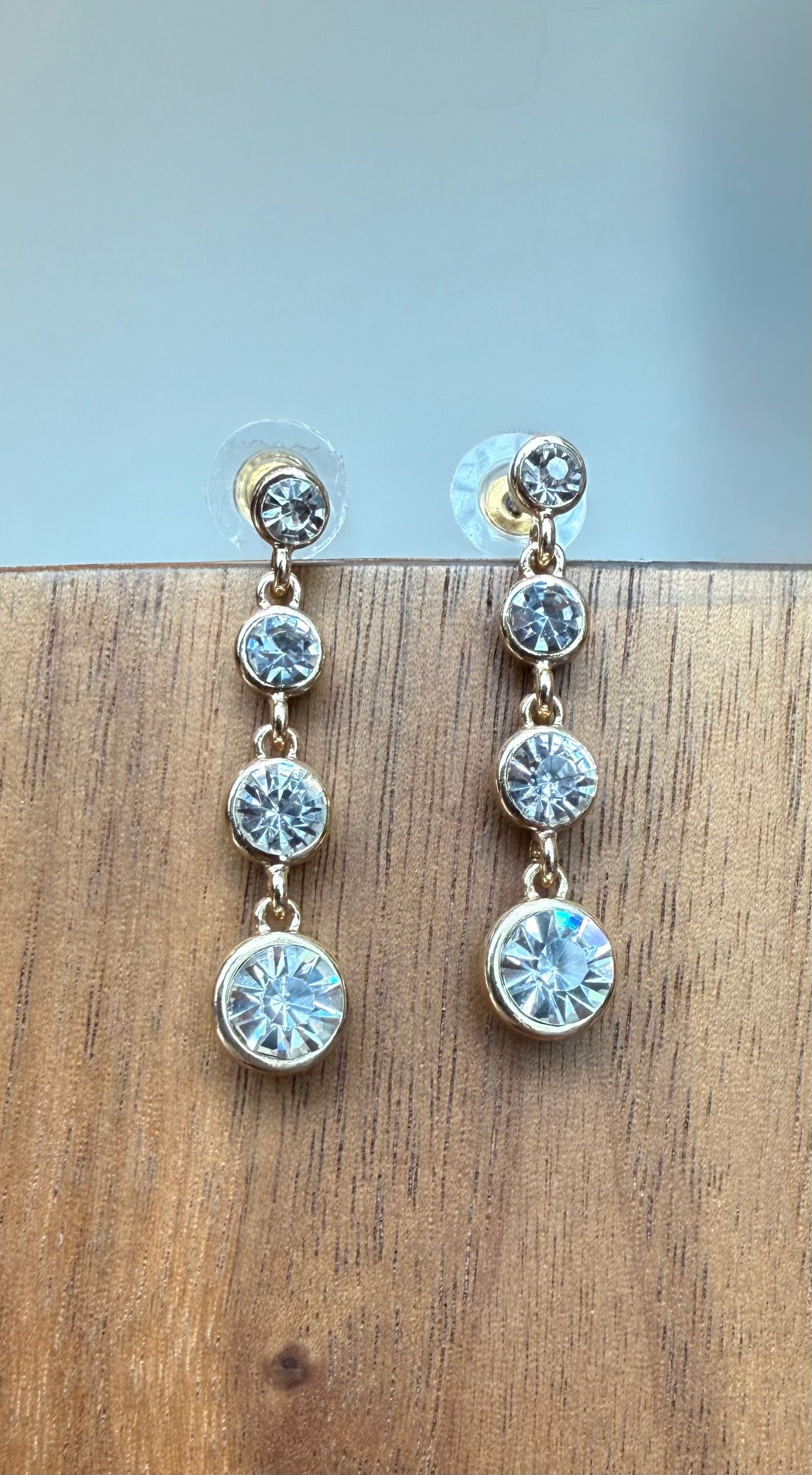 Chevron down icon Chevron down icon Graduated Crystal Dangle Earrings No reviews Sale $28.00 | / Add to cart Spinner icon IN STOCK - ONLY 1 LEFT! READY TO SHIP Notify me when back in stock Email address Email me when available Post Gold finish 1.5"L x .25"W