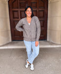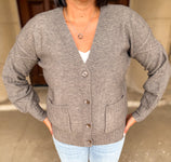 Elevate your layering game with this soft V-neck cardigan, featuring a classic button-front design and front patch pockets for everyday ease. Ribbed trim adds structure, while the textured sleeve detail and dropped shoulders bring a relaxed, modern feel. Finished in a versatile stone hue.