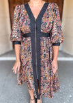 The V neckline and front gold zipper add a touch of sophistication, while the 3/4 puff sleeves and contrast stitch detail create a unique flair. With convenient pockets and a midi length, this dress is as functional as it is fashionable.