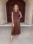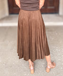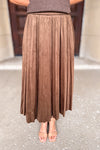Soft and sophisticated, this pleated midi skirt features a luxe suede finish and a flowy silhouette that moves with ease. The elastic waistband offers a comfortable fit, while the full lining ensures a smooth feel. Made with recycled materials for added sustainability.